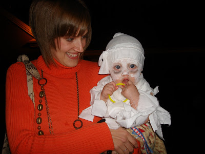 For Halloween this year, mom decided I'd make a cute Mummy. She painted my face and after putting me in leggings (how embarrassing!) and a onesie, she began wrapping me up in fabric she had ripped up. I was a such a good boy and held real still while sitting on the bathroom counter to let her paint my face. I looked so scary! I didn't even cry while she wrapped me up either! Well, at least for half of it...I can only sit still for so long. These are some pictures with me and my play date friends at our ward "Trunk-or-Treat."